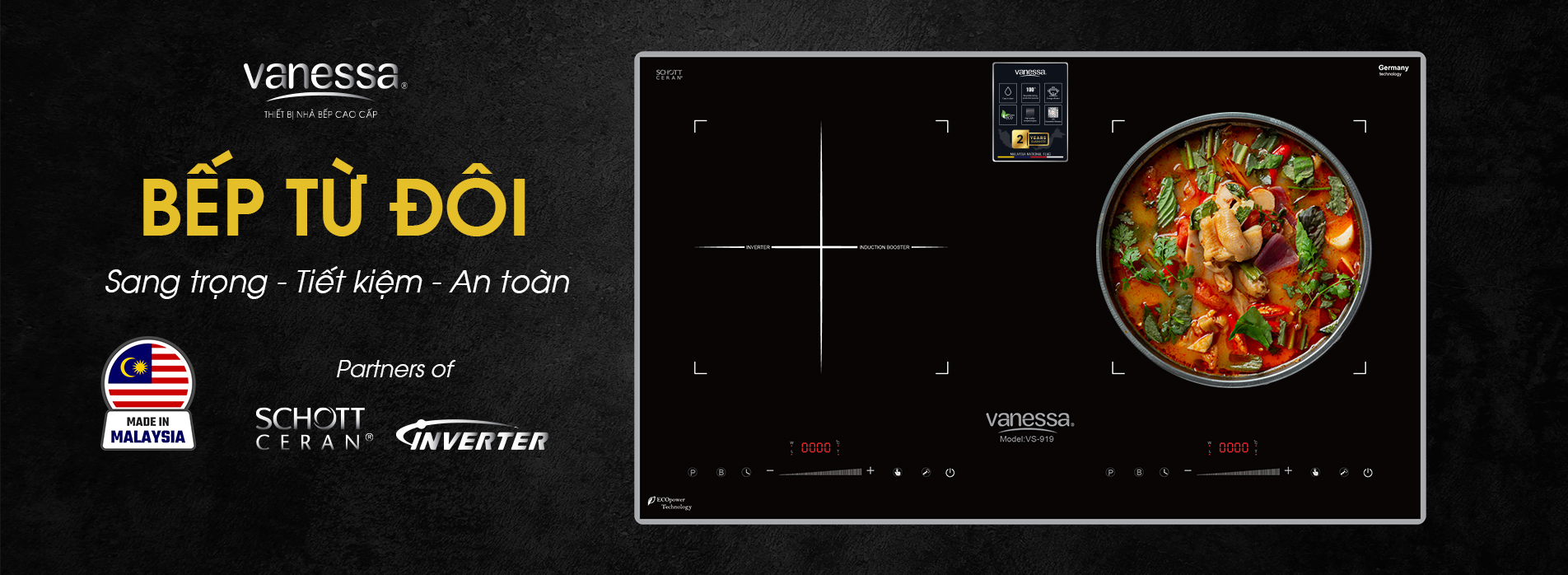 Chính sách hậu mãi Sản phẩm bếp đôi điện từ được áp dụng chế độ hậu mãi hàng đầu với mạng lưới bảo hành trên cả nước và nhân viên kĩ thuật chuyên nghiệp từ VANESSA. Đặc biệt, thời gian bảo hành của sản phẩm là 36 tháng và được áp dụng chế độ bảo hành tại nhà, giúp người dùng an tâm tuyệt đối về chất lượng và dịch vụ.